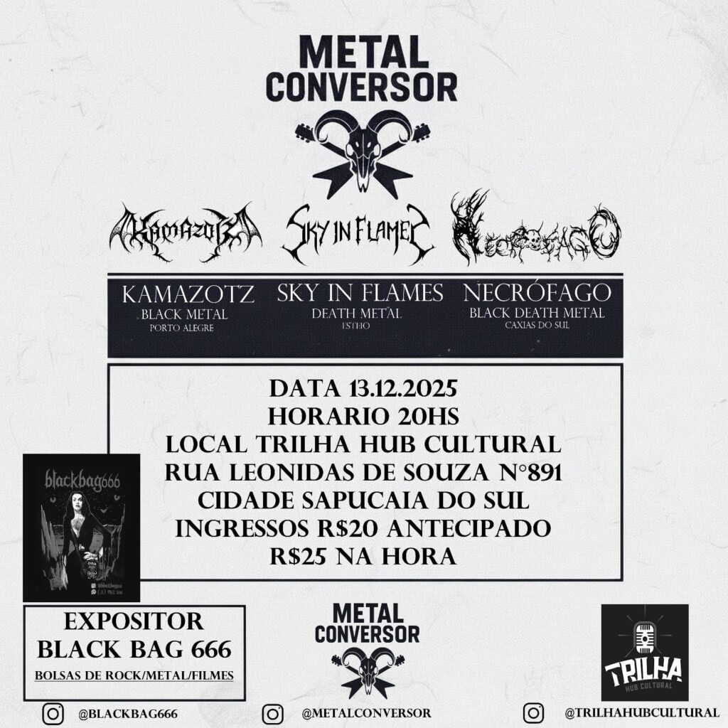 Para encerrar o ciclo de atividades de 2025, a banda gaúcha de Death Metal SKY IN FLAMES confirmou sua participação na primeira edição do evento ‘Metal Conversor’. O festival, que marca a última apresentação do grupo no ano, ocorre no dia 13 de dezembro de 2025 (sábado), a partir das 20h, no Trilha Hub Cultural (@trilhahubcultural), em Sapucaia do Sul/RS.