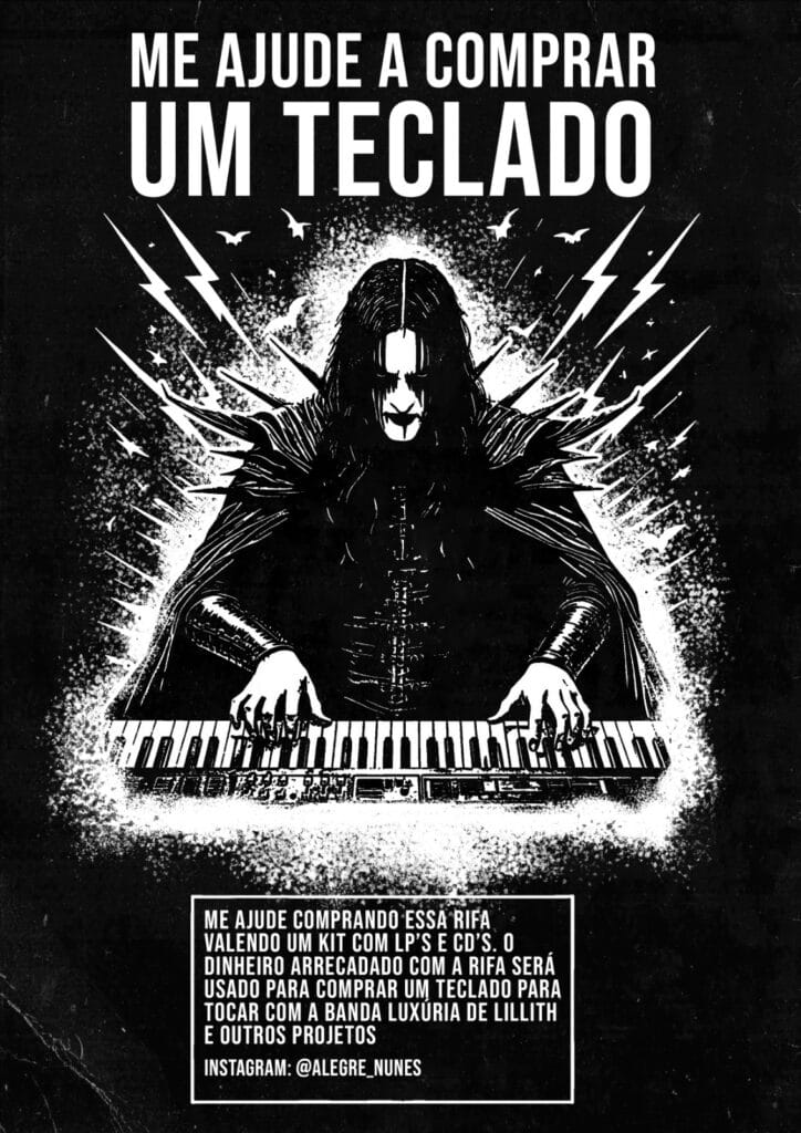 “Quer apoiar um músico underground? Então participe da rifa e concorra a um kit com 3 LP’s, 3 CD’s e um K7 de metal extremo. Por apenas R$ 10,00, você pode comprar um número e ter a chance de ganhar esse kit pesadíssimo. O teclado será usado com a banda Luxúria de Lillith e outros projetos musicais”.