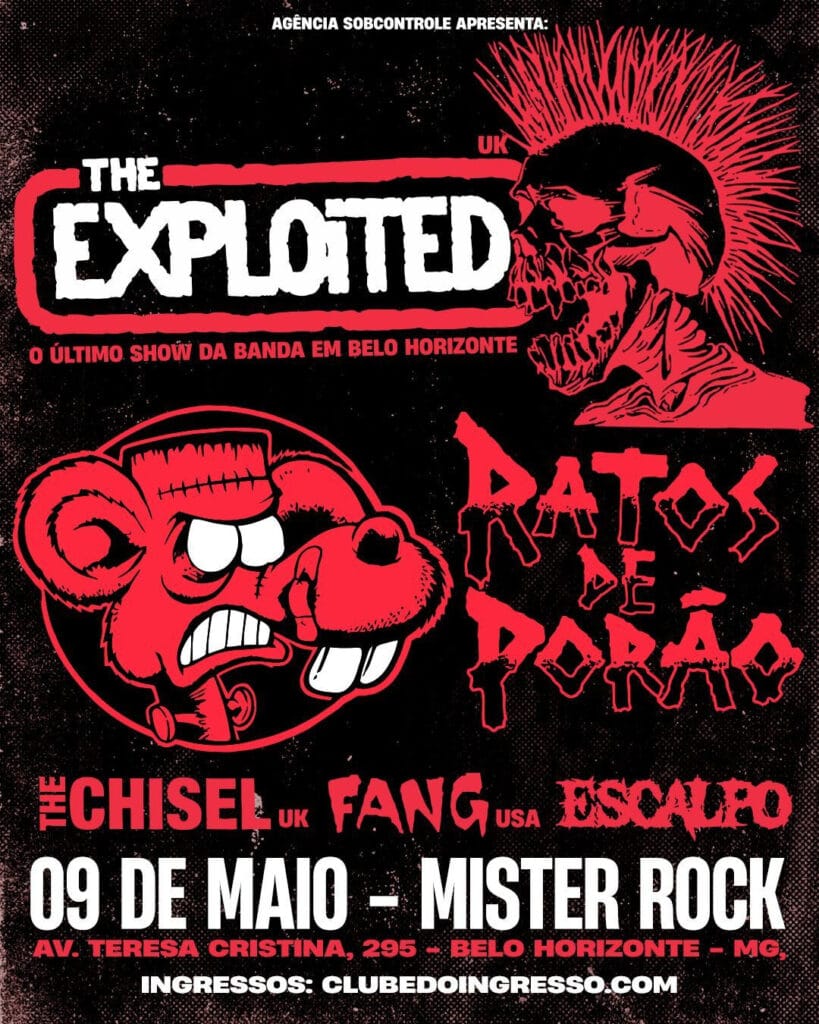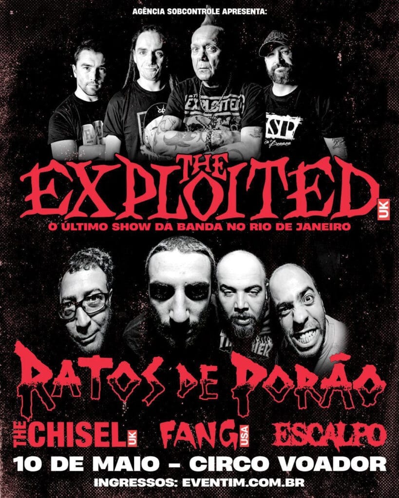 Rio de Janeiro (RJ) e Belo Horizonte (MG) entram na rota da turnê de despedida dos palcos da lenda punk mundial The Exploited, que passa pelo Brasil em maio de 2025. Na capital mineira, o show é dia 9/05 no Mister Rock e, no Rio de Janeiro, dia 10/05, no Circo Voador. Ratos de Porão também é atração em ambas as datas. A realização é da Agência Sobcontrole.