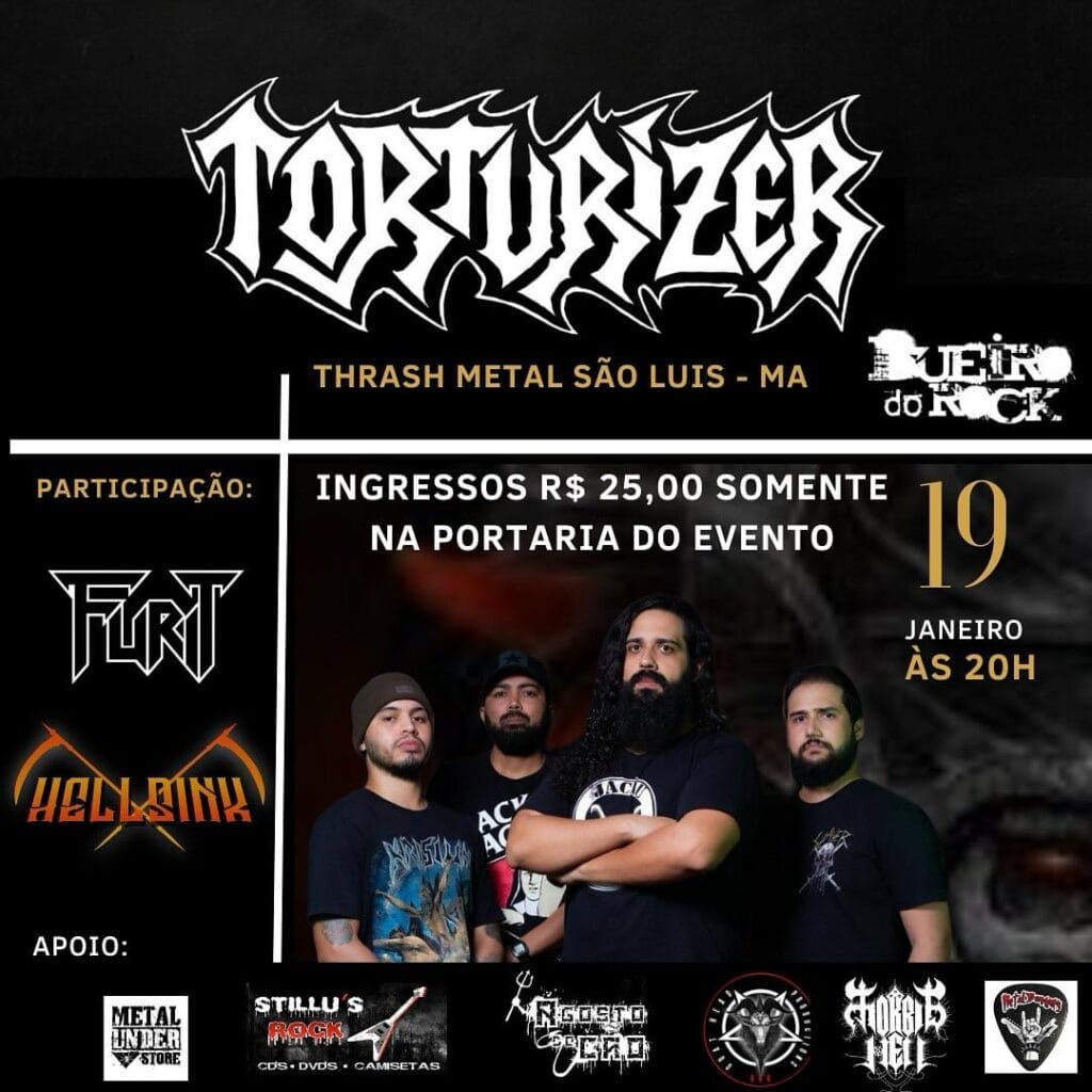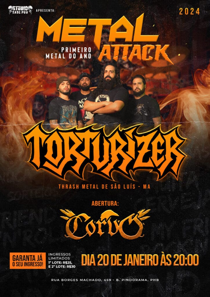 No dia seguinte (20/01), o TORTURIZER pega a estrada até Parnaíba/PI onde se apresentam ao lado de Corvo no ‘Metal Attack’, evento que acontece no Studio Nasc Pub a partir das 20 horas. Confira abaixo o cartaz e serviço completo: