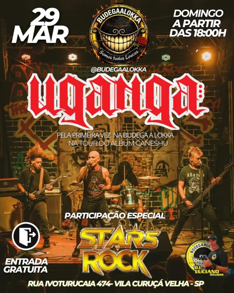 A lendária banda mineira Uganga continua cruzando o país com a turnê de seu mais recente e aclamado álbum, Ganeshu. No próximo dia 29 de março (domingo), o grupo desembarca pela primeira vez na Budega a Lokka, importante reduto do rock na Zona Leste de São Paulo.