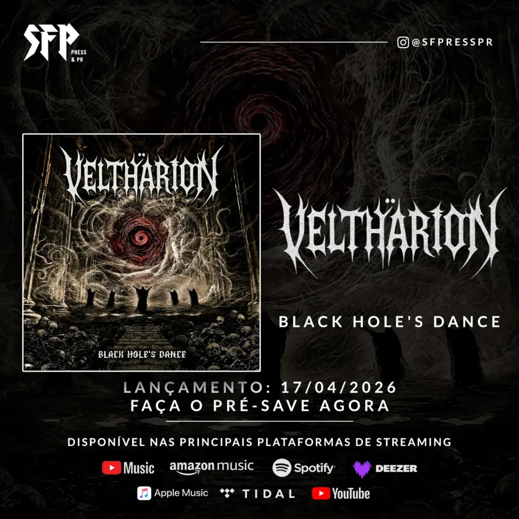 O grupo baiano de Death/Black Metal VELTHARION prepara o lançamento de seu novo álbum, “Black Hole’s Dance”, que chega às principais plataformas de streaming nesta sexta-feira, 17 de abril, via Sangue Frio Records.