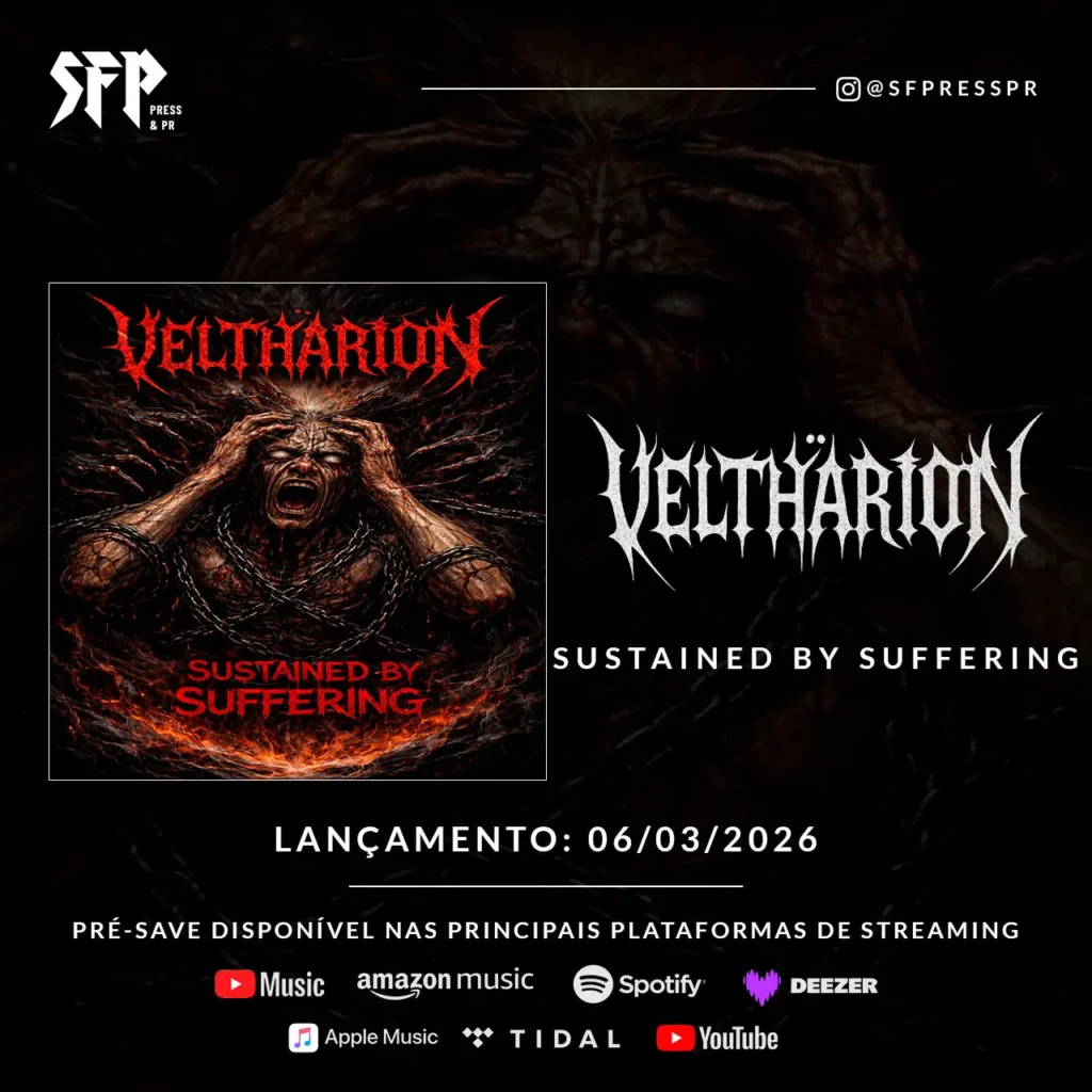 VELTHARION, banda baiana de Death/Black Metal, confirmou para esta sexta-feira, dia 06 de março de 2026, o lançamento oficial do single “Sustained By Suffering”. Sob a chancela da Sangue Frio Records, a faixa marca a estreia definitiva do quarteto nos serviços digitais.