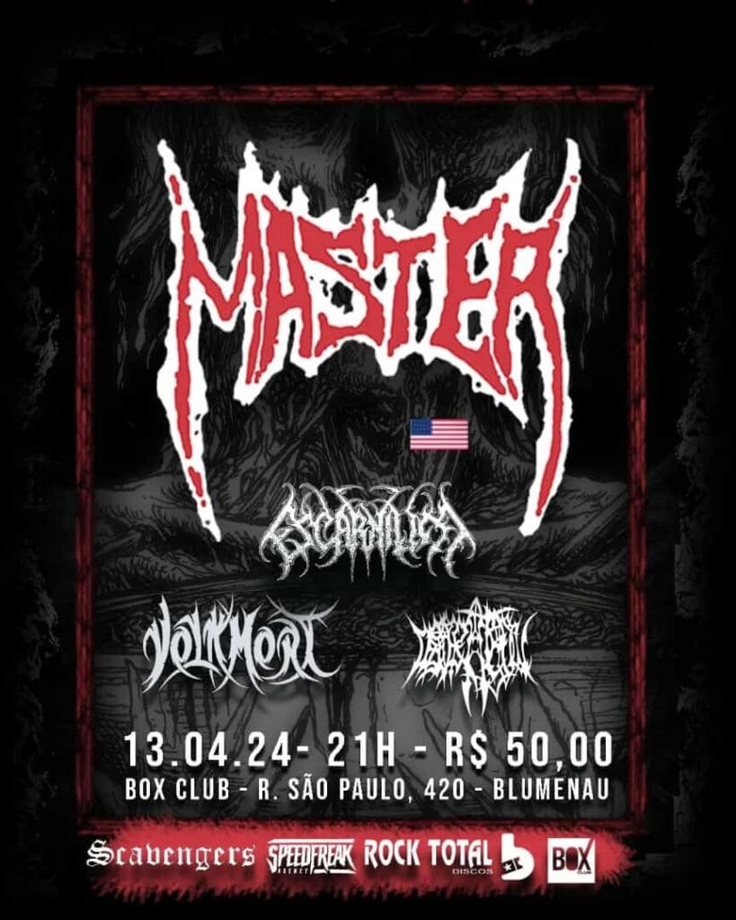 Os catarinenses do VOLKMORT estão nos preparativos finais para mais um show histórico em sua carreira. A banda estará HOJE (13/04) no Box Club em Blumenau/SC, onde dividirá palco com nada mais nada menos que a lenda norte-americana Master. Também estarão presentes os mineiros do Escarnium e Desperate Soul. Confira abaixo o cartaz e serviço completo para mais informações: