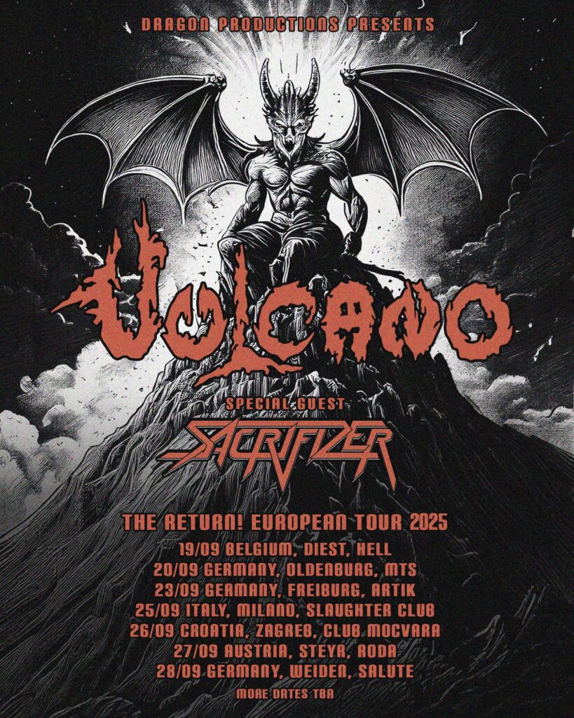 A lenda do Metal Extremo sul-americano, VULCANO, anunciou seu aguardado retorno à Europa após seis longos anos. A banda embarcará na “The Return! European Tour 2025”, acompanhada pelos franceses do Sacrifizer. A turnê já conta com datas confirmadas na Bélgica, Alemanha, Itália, Croácia e Áustria, com início previsto para setembro deste ano.
