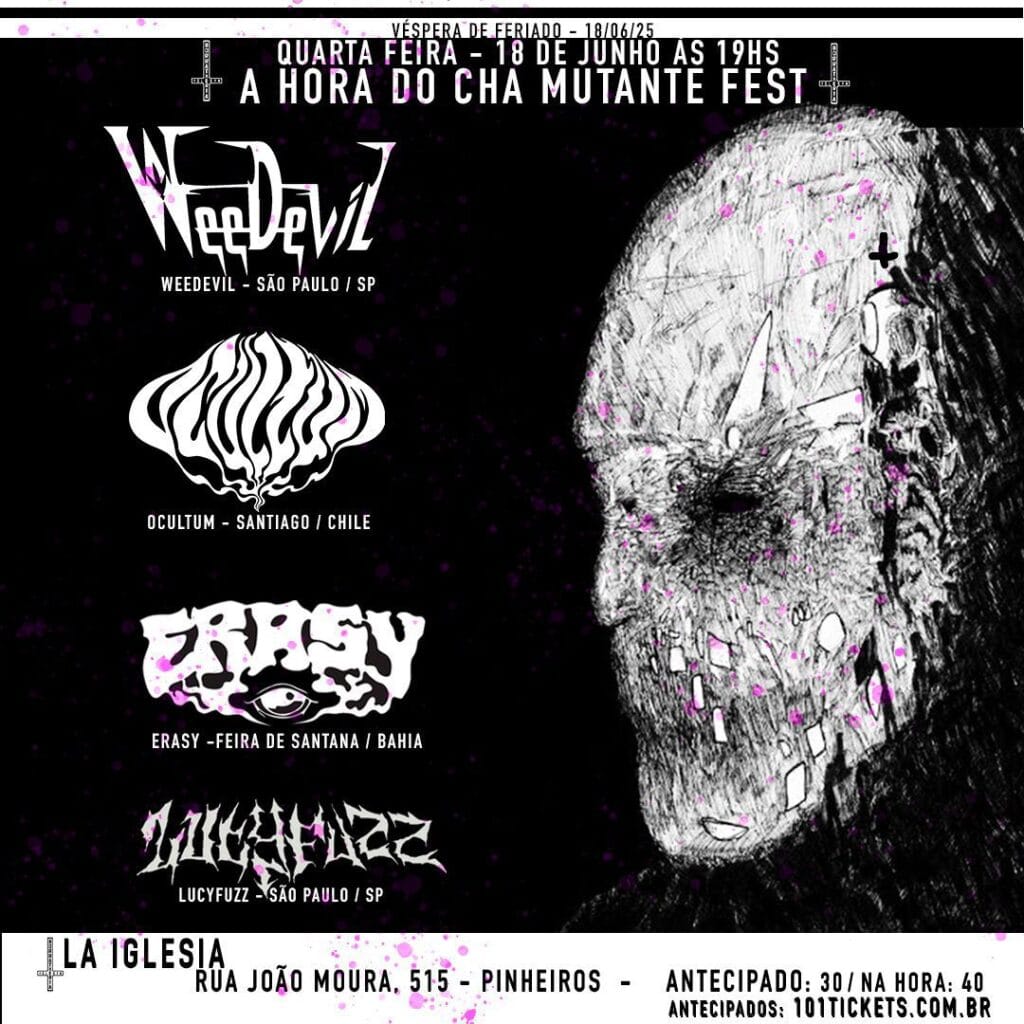 Na quarta-feira, 18 de junho, véspera de feriado, o WeeDevil sobe ao palco ao lado dos chilenos da Ocultum no festival “A Hora do Chá Mutante Fest”, que acontece na La Iglesia (R. João Moura, 515 – Galpão 6, Pinheiros – SP). Também integram o lineup as bandas Erasy e Lucyfuzz. Os shows começam a partir das 19h.