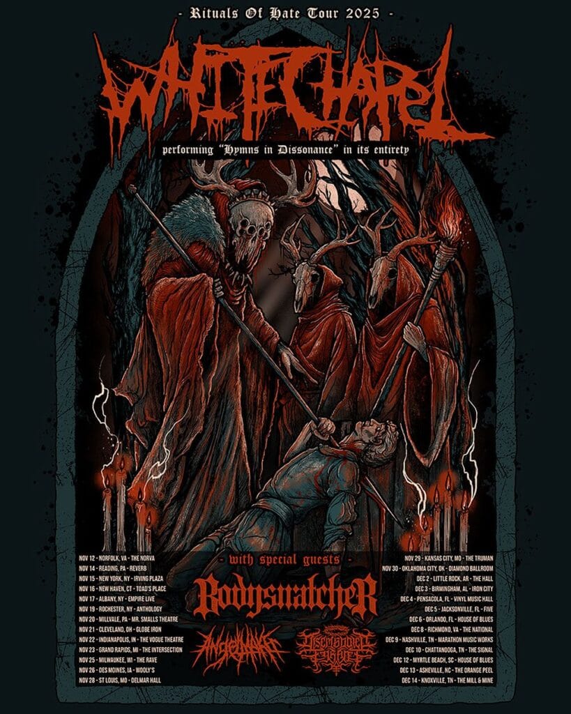 O WHITECHAPEL retornará aos palcos dos EUA neste outono com a turnê Rituals Of Hate . A jornada passará por mais de duas dezenas de cidades de 12 de novembro a 14 de dezembro e verá a banda apresentar seu novo álbum , Hymns In Dissonance, aclamado pela crítica, em sua íntegra devastadora, ao lado de alguns clássicos. O apoio será oferecido por Bodysnatcher , Angelmaker e Disembodied Tyrant .